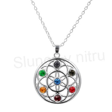Tvar Reiki Chakra přívěsek 7 čaker kameny přívěsek květ života s drahokamy - zirkony s řetízkem, náhrdelník, galvanizováno. Popis čakrových center ZDE.