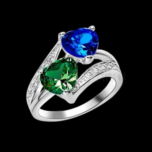 Krásný ozdobný prsten ve tvaru srdce se zeleným a modrým zirkonem. Ručně zpracováný, dokonalá jemná práce. Uprostřed prstenu je zelený, modrý zirkon, kde dobře vynikají jednotlivé plošky brusu, po okrajích prstenu jsou malé čiré zirkony, užasná kombinace, z kvalitního kovu platinovépokovování. Jedná se o český styl. Modní doplněk k ostatním šperkům, krásně ladí. Prsten je zvláštní svou originalitou a krásou.