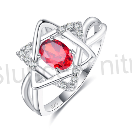 Krásný postříbřený prsten s broušeným granátem ve tvaru hvězdy a bílými topazy nejvyšší kvality. Prsten má nepřehlédnutelný třpytivý vzhled. Krásný třpytivý šperk s čirým kamenem nejvyší kvality, jehož krása je zdůrazněna dopadem světla na jednotlivé plošky výbrusu, vhodný pro různé příležitosti, svatby,zásnuby, dar. Rhodium dodavá šperkům luxusní vzhled a zárověn chraní před jeho přirozenou oxidací. Prsten má celkem 9 kamenů. Prsten je dodělávan ručně, každý je originální.