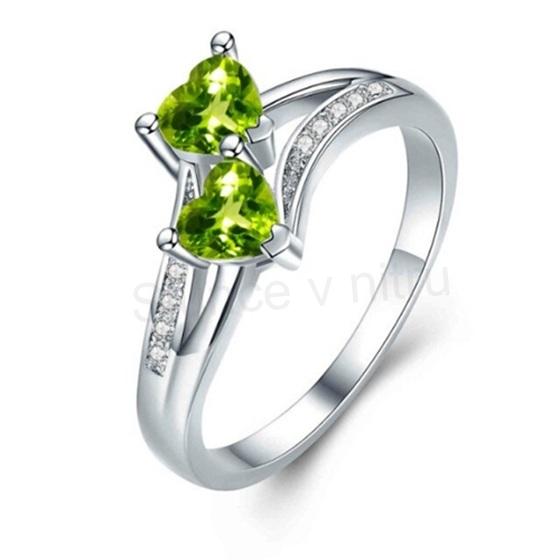 Krásný ozdobný prsten ve tvaru srdce se zelenými zirkony (vzhled olivínu) zirkony. Ručně zpracováný, dokonalá jemná práce. Uprostřed prstenu jsou zelené zirkony, kde dobře vynikají jednotlivé plošky brusu, po okrajích prstenu jsou malé čiré zirkony, užasná kombinace, z kvalitního kovu platinovépokovování. Jedná se o český styl. Modní doplněk k ostatním šperkům, krásně ladí. Prsten je zvláštní svou originalitou a krásou.