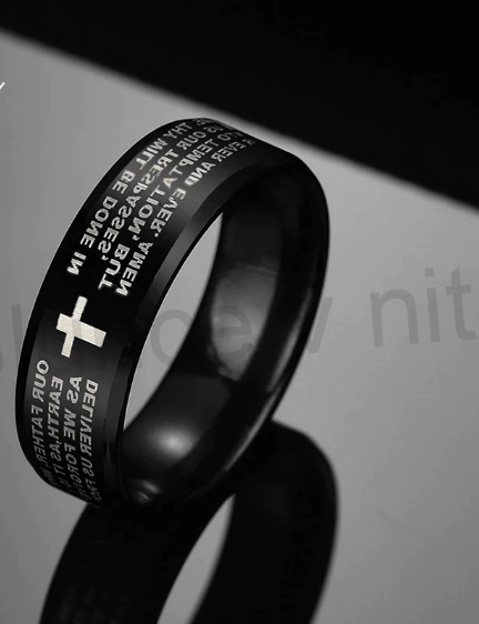 Zásnubní, snubní, modní, punc, prsten kříž z titánové oceli, lesklý, galvanizováný, černé barvy. Nese napis s modlitebním nápisem, proto je i prsten vhodný jako svatební prstýnky. Vysoké kvality, aby dobře vynikla jeho krása a lesk. na světle odraží lesk. Prsten je originální, má dvě funkce buď jako modní doplněk, nebo na velmi zvláštní slavnostní den. Prsten je vhodný ke všem ostatním šperkům a pro všechny události. Prsten je určen pro věřicí i nevěřicí, kříž je symbol ochrany.