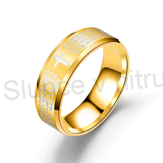 Zásnubní, snubní, modní, punc, prsten kříž z titánové oceli, lesklý, zlaté barvy. Nese napis s modlitebním nápisem, proto je i prsten vhodný jako svatební prstýnky. Vysoké kvality, aby dobře vynikla jeho krása a lesk. na světle odraží lesk. Prsten je originální, má dvě funkce buď jako modní doplněk, nebo na velmi zvláštní slavnostní den. Prsten je vhodný ke všem ostatním šperkům a pro všechny události. Prsten je určen pro věřicí i nevěřicí, kříž je symbol ochrany.
