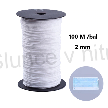 Originál nylonová elastická, pruženka, šňůrka na obličejovou masku, která se dává za ucho. Použivá se ve zdravotnictví na roušky, proto je velmi oblíbená, pro její lehkost, pružnost, vynikající materiál. Každé balení má minimálně 100 m návin, je překontrolován a nemá žádné zauzlení ani napojení.