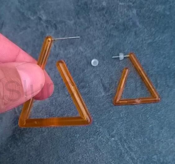Puzetové náušnice otevřený trojúhelník z pryskyřice a nerez oceli. Zajimavý modní motiv, můžete nosit kamkoliv půjdete. Náušnice mají zapínání na puzetu jištěné plastovou zarážkou. Svatby, slavnosti, dárky. Náušnice jsou velmi lehoučké.