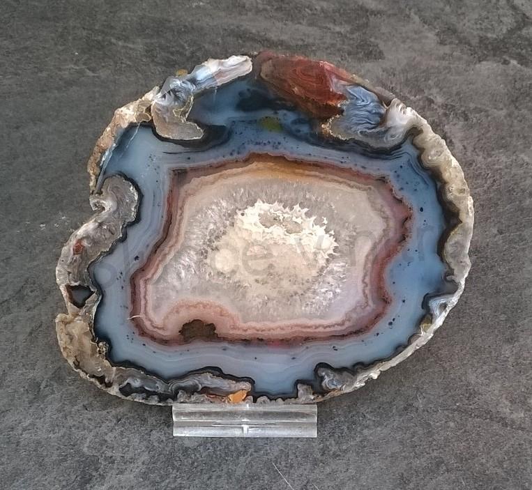 Výběrový Achátový plátek je průsvitný oboustranně leštěný, jeho přírodní kresba nejlépe vynikne při pohledu proti světlu. Lze použít jako ozdobu interiéru, nebo jako okrasné kameny do zahrad, exteriéru a domovů. K tomuto kusu achátu vám přidáme také plastový podstavec.