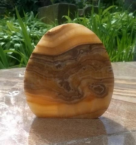 Aragonit řezaný, leštěný, má seříznutou spodní stranu, která slouží k postavení, leštěný řez je z jedné čelní strany. Vhodné jako těžítka, dekorativní předměty. Lze použít jako ozdobu interiéru, nebo jako okrasné kameny do zahrad a exteriéru.