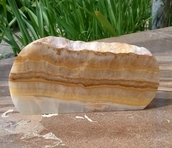 Aragonit řezaný, leštěný, má seříznutou spodní stranu, která slouží k postavení, leštěný řez je z jedné čelní strany. Vhodné jako těžítka, dekorativní předměty. Lze použít jako ozdobu interiéru, nebo jako okrasné kameny do zahrad a exteriéru.