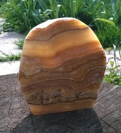 Aragonit řezaný, leštěný, má seříznutou spodní stranu, která slouží k postavení, leštěný řez je z jedné čelní strany. Vhodné jako těžítka, dekorativní předměty. Lze použít jako ozdobu interiéru, nebo jako okrasné kameny do zahrad a exteriéru.