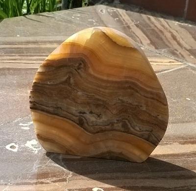 Aragonit řezaný, leštěný, má seříznutou spodní stranu, která slouží k postavení, leštěný řez je z jedné čelní strany. Vhodné jako těžítka, dekorativní předměty. Lze použít jako ozdobu interiéru, nebo jako okrasné kameny do zahrad a exteriéru.
