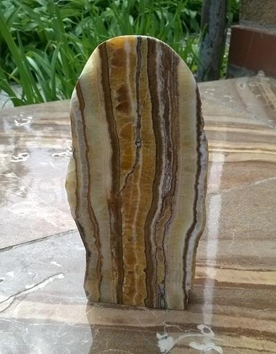 Aragonit řezaný, leštěný, má seříznutou spodní stranu, která slouží k postavení, leštěný řez je z jedné čelní strany. Vhodné jako těžítka, dekorativní předměty. Lze použít jako ozdobu interiéru, nebo jako okrasné kameny do zahrad a exteriéru.
