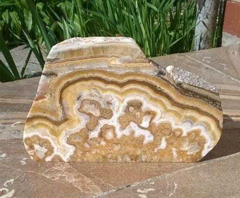 Aragonit řezaný, leštěný, má seříznutou spodní stranu, která slouží k postavení, leštěný řez je z jedné čelní strany. Vhodné jako těžítka, dekorativní předměty. Lze použít jako ozdobu interiéru, nebo jako okrasné kameny do zahrad a exteriéru.