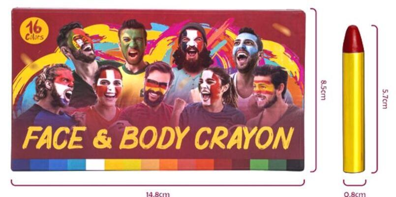 Tato barva na obličej je speciálně vyrobena pro fotbalové soutěže, můžete snadno nakreslit barvy vlajky 16 jasných barev, nebo oblastí, pestré barvy, mohou nakreslit všechny vzory, které chcete zobrazit na svém obličeji/těle. Sada pro malování na obličej je bezpečná a netoxická, snadno se aplikuje na pokožku, je barevná a odolná proti potu.