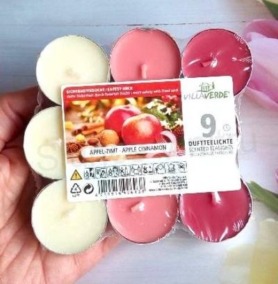 Svěží vonná sada čajových svíček ve třech barvách s vůni jablka a skořice. Vůně navodí relaxační a romantickou atmosféru. Sada obsahuje 9 ks svíček. Použití do aromatckých lamp, svicnů, nebo jentak jako dekorace na stůl.