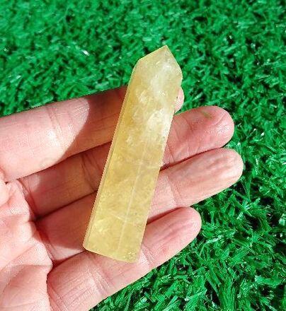 Broušená špice citrínu s s náznaky duhy, lze použít jako ozdobu interiéru, nebo jako okrasné kameny do zahrad, exteriéru a domovů. Špice je vybroušená z jednoho kamene.