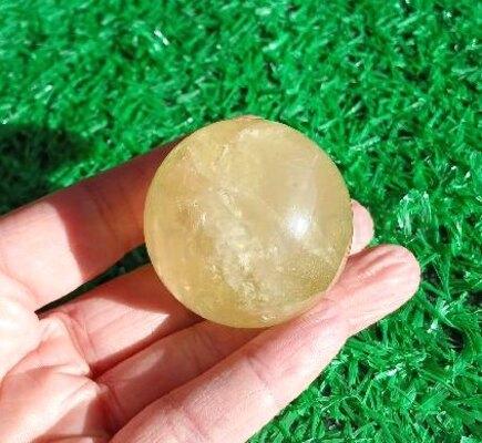 Krásná leštěná koule citrínu s náznaky duhy, lze použít jako ozdobu interiéru, nebo jako okrasné kameny do zahrad, exteriéru a domovů. Koule je vybroušená z jednoho kamene.