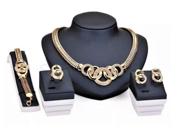 Zajimavá dámská souprava, set s čirými kamínky. souprava, pro dívky, či ženy ve zlatém provedení. Souprava má jemné ozdobné zdobení, kde je hlavní ozdoba do tvaru 3 kruhů, hlavní kruh je zdoben čirými kamínky . Souprava se skladá ze 4 dilů - náušnice, nastavitelný prsten, náramek, náhrdelník. Nádherná kombinace vytvářejicí zajímavý efekt šperku. Náušnice jsou puzetového typu. Je to elegantní sada modních doplňků. Hodí se všude jak na slavnosti, práce, tak výročí. Krásný český styl, velmi elegantní. Prsten si můžete lehce nastavit.