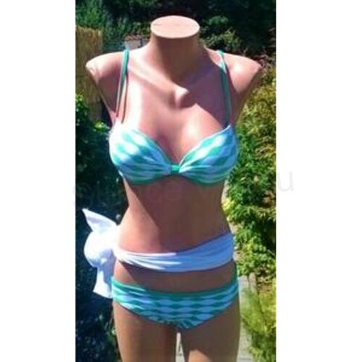 Dvoudílné dámské plavky mají moderní vzor vln v kombinaci bílé a zelené barvy. Podprsenka typu „mašličková“ má tvarované vycpávky, nastavitelná ramínka a klasické plavkové zapínání na zádech. Spodní díl je bokový, podšitý a díky elastickému materiálu se pohodlně přizpůsobí postavě.