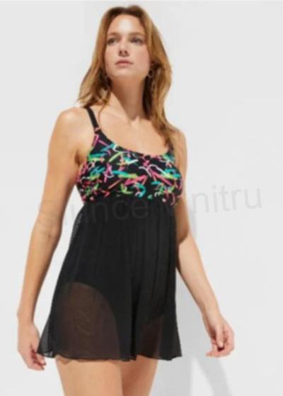 Plavky mají nastavitelná ramínka, jemnou výztuhu bez kostic a podšívku v rozkroku pro větší komfort. Barevně výrazný vršek s geometrickým vzorem krásně zvýrazňuje dekolt, zatímco černá splývavá sukně opticky zeštíhluje postavu. Měkký, pružný a rychleschnoucí materiál je příjemný na těle a vhodný pro plavání, sportování, vířivku i běžné nošení na pláži.