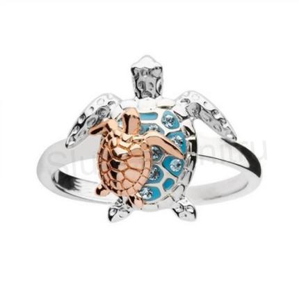 Zajimavý jemný dámský, dívčí prsten ve tvaru želvy, želva prsten má dvě želvičky matku s mládětem v barevném provedení. Želvičky jsou vytvarovány do podrobna.