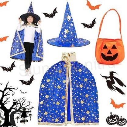 Čarodějnický plášť je z polyesteru, měkký, šetrný k pokožce, velmi příjemný a prodyšný na nošení. Navrženo pro děti, které hrají roli čarodějnice nebo kouzelníka. Kostým se skládá ze 3 kusů - 1 x klobouk, 1 x plášť, 1 x taška na sladkosti.Design je jako klasická čarodějnice nebo kouzelník velmi krásný a zajímavý. Je to perfektní dekorační dárek pro halloweenské party, karneval, dárek k narozeninám. Měkký, šetrný k pokožce, velmi příjemný a prodyšný na nošení. Snadné oblékání a svlékání. Dárek náhodná tetovačka