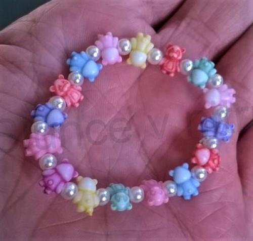 Dětský korálkový náramek s malým barevným medvídkem a imitace perličky AB. Je pružný zpevněný dvojitou gumičkou. Ruční výroba. Udělejte jim radost. Je zdravotně nezavadaný. Nevhodné pro děti mladší 3 let, hrozí spolknutí malých častí. Náramek je lehoučký nikde neškrtí.