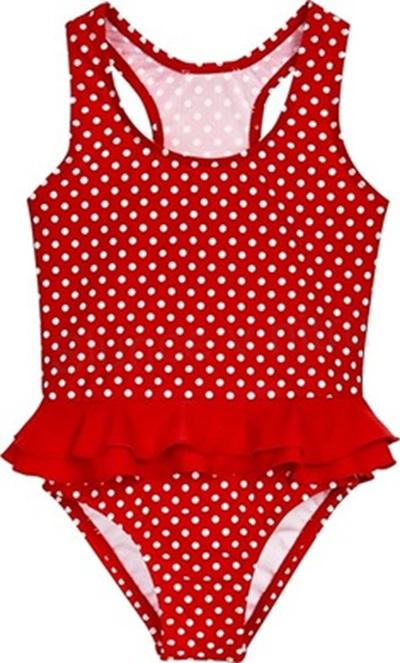 Roztomilé dívčí jednodílné plavky v červené barvě s bílými puntíky a volánky v oblasti boků jsou ideální volbou pro malé plavkyně. Jsou vyrobené z měkkého, rychleschnoucího a velmi příjemného materiálu, který umožňuje volný pohyb při plavání, sportování i hraní na pláži.