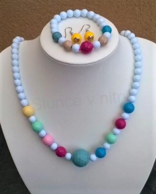 Divčí sada, souprava šperků, určitě potěší kdejakou slečnu, která obsahuje korálkový náhrdelník s větším korálkem uprostřed, menšíma a většíma okolo a nejmenšíma až k zapínání, korálkové visací náušnice na klasickém afroháčku. Korálky na náhrdelníku jsou navlečeny na pevném vlasci zakončené na karabinkovém zapinání. Korálky jsou fasetované. Náramek je na pružné gumce.
