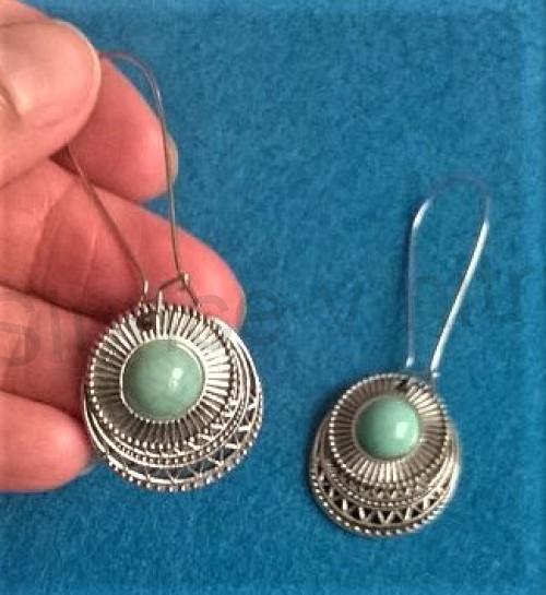 Nádherné etnické Bohemia visací náušnice ve tvaru kruhu jsou téměř dokonalé svou propracovaností, navíc náušnice tvoří minerál syntetický tyrkenit, na světle se více rozzáří a tím vynikne jejich krása, jsou jemné modní vhodné na každodenní nošení a jakákoliv společnost. Nerezový, dlouhý háček na zacvaknutí.