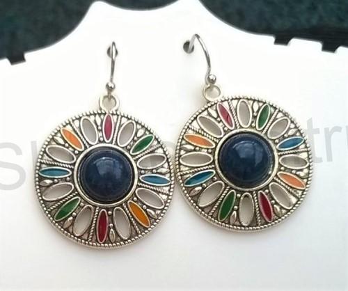 Nádherné etnické Bohemia visací náušnice ve tvaru kruhu v barevném provedení, jsou téměř dokonalé svou propracovaností, kruh s barevným kamínkem uprostřed a tím vynikne jejich krása, navíc mají barevné smaltování, jsou jemné modní vhodné na každodenní nošení a jakákoliv společnost. Nerezový, klasický háček. Zajištěno silikonovýma zarážkama.
