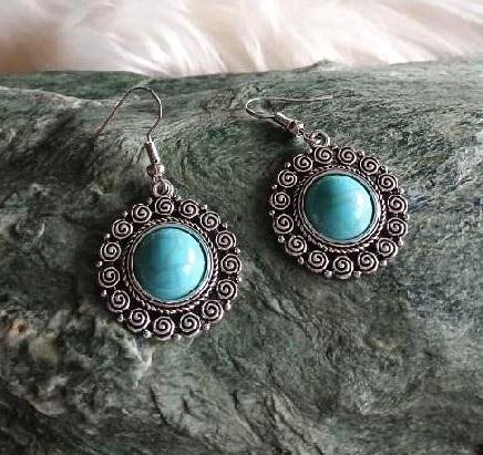 Nádherné etnické Bohemia visací náušnice v nepravidelném tvaru, jsou téměř dokonalé svou propracovaností, navíc náušnice tvoří minerál syntetický tyrkenit, na světle se více rozzáří a tím vynikne jejich krása, jsou jemné modní vhodné na každodenní nošení a jakákoliv společnost. Nerezový, dlouhý háček na zacvaknutí.