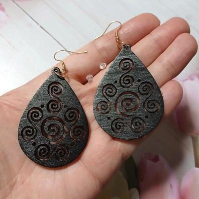 Dřevěné ozdobné náušnice v černém provedení jsou ideální volbou pro ženy, které milují výrazné, ale zároveň lehké a pohodlné šperky. Ornamentální spirálový výřez vytváří vzdušný, dekorativní efekt, díky kterému náušnice krásně vyniknou při každém pohybu.