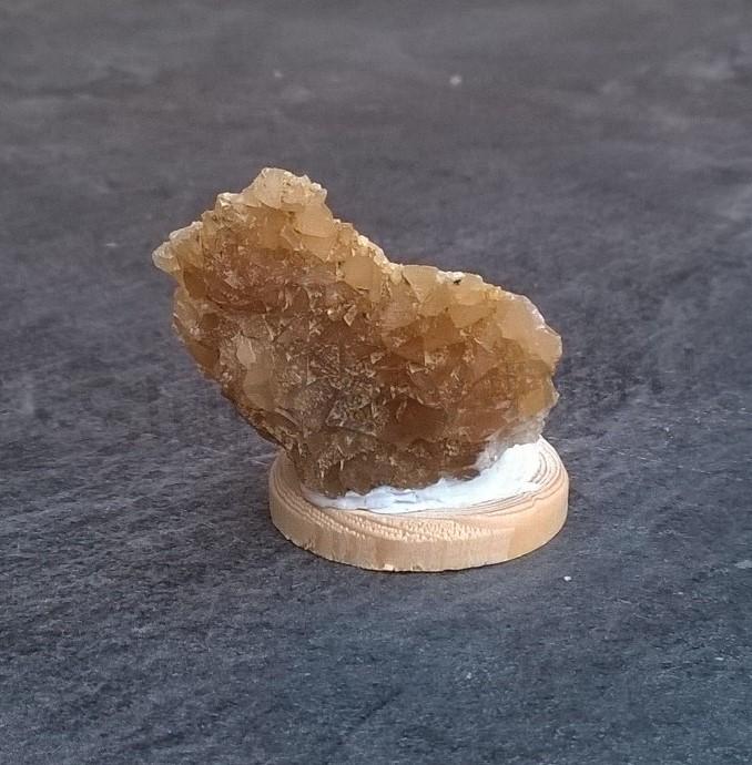 Malí kousek kalcitu žlutého - medového na dřevěném podstavci