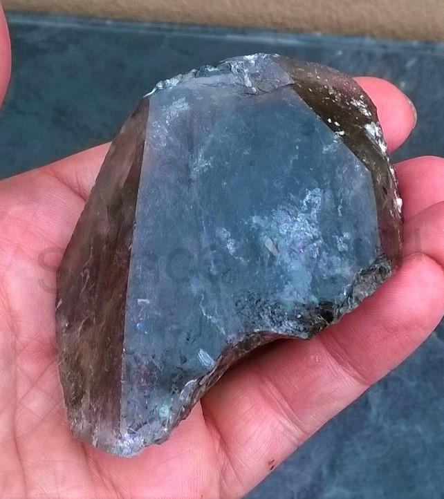 Úlomek se záhnědové větší špice v tmavé barvě s duhovími odlesky, hnědá tmavá barva je jen velmi málo průsvitná