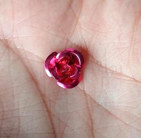 Navlékněte růžičku na ketlovací nýtek (průvlek vede středem květu) a zavěste na řetízek pro vytvoření náramku cinkáčku, nebo také použijte jako formu kabošonu a nalepte na kabošonové lůžko (přívěskové, náušnicové, prstenové, náramkové)