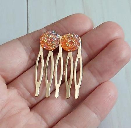 Tento elegantní hřeben do vlasů v lesklém zlatém provedení je zdoben dvěma růžovo‑oranžovými perličkami z pryskyřice o velikosti cca 12 mm. Je vyroben z kvalitního kovu, který zajišťuje pevnost, stabilitu a dlouhou životnost. Perličky jsou pevně nalepené, takže při nošení drží spolehlivě a dodávají účesu jemný, ale výrazný dekorativní prvek. Hřeben má 5 zubů a díky svému tvaru dobře sedí v různých typech vlasů — od jemných až po husté. Jde o naši vlastní výrobu, takže každý kus je pečlivě zpracovaný a originální.