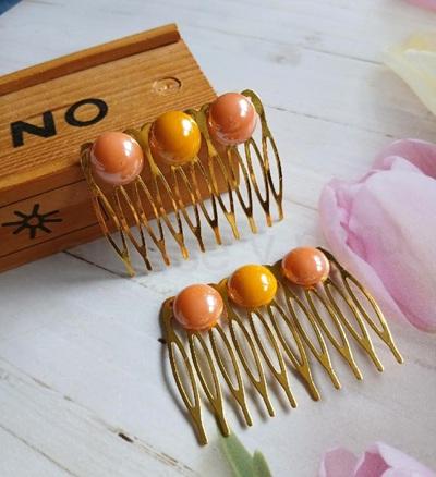 Tento ručně vyráběný hřebínek je zdoben třemi výraznými pokovenými perlami o velikosti cca 14 mm v kombinaci broskvové a oranžové barvy. Teplé odstíny perel krásně vyniknou ve světle i ve vlasech a dodají účesu jemný, elegantní a dekorativní vzhled.