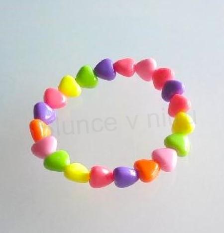 Krásný korálkový náramek s barevnými srdíčky. Srdíčka jsou navlečeny na průžné přizpůsobivé gumičce. Náramek je velmi lehký, krásná barevná kombinace, dodavá okouzlujicí a uchvatný vzhled. Vhodný na jakoukoliv příležitost.