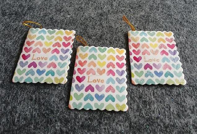 Otevirací ozdobná jmenovka, kartička, visačka na dárky, jsou nepostradatelným dekoračním prvkem při balení dárků. Zabalte dárky a přivažte k nim jednu z těchto krásných kartiček, zdobené lesklou barvou se třpytky v podobě srdíček, při otevření kartičky můžete napsat jméno obdarovaného. Ke každé jmenovce je přidaná luxerová šňůrka ve zlaté lesklé barvě na přichycení.