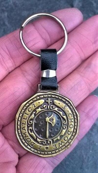 Klíčenka je vyrobena z kvalitního, nezávadného materiálu z kovu a pravé kůže. s nápisem S Chodowe z Domažlicz se znakem sekyry, valašky, kterou používali chodové na obranu svého území. Vhodná na kabelky, tašky, batohy, peněženky, ozdobná dekorace.
