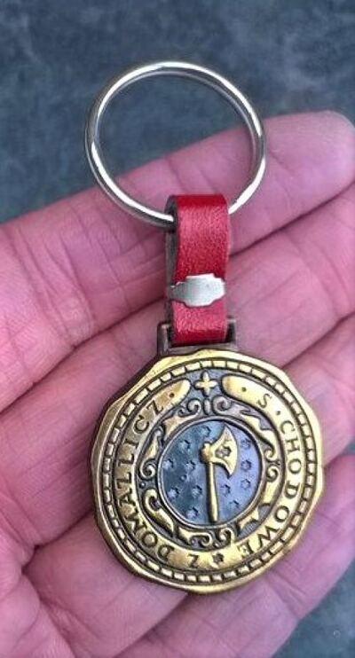 Klíčenka je vyrobena z kvalitního, nezávadného materiálu z kovu a pravé kůže. s nápisem S Chodowe z Domažlicz se znakem sekyry, valašky, kterou používali chodové na obranu svého území. Vhodná na kabelky, tašky, batohy, peněženky, ozdobná dekorace.