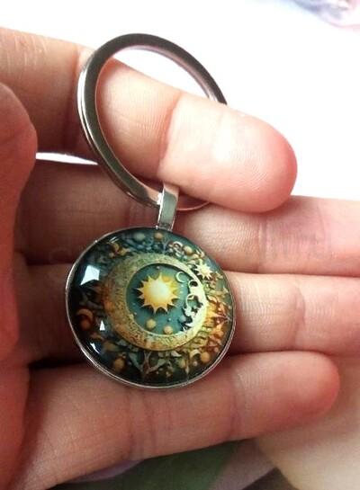 Klíčenka, přívěšek s přívěškem slunce s měsícem. Vhodné na kabelky, tašky, batohy, peněženky, ozdobná dekorace.