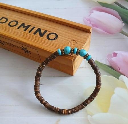 - Korálkový kokosový dřevěný náramek hnědý s tyrkysovými korálky, korálky 5 mm (BC655)
