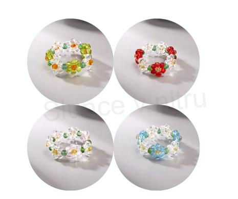 Zajímavý korálkový kytičkový prsten v barevných kombinacích. Prsten se dá lehce přizpůsobit, protože korálky jsou navlečený na pružném silonu. Lehce se přizpůsobí i velikosti 9. Jedná se o styl korálkovaní, prsten velmi dobře drží, nemusíte se bát, že se rozpojí. Doporučuje se jednat s prstenem jako s klasickým šperkem.