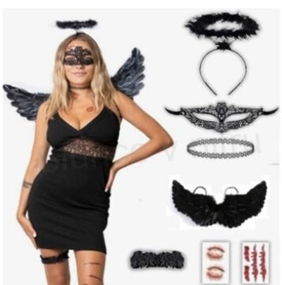 Dámský, dívčí kostým černého anděla, andělská křídla, pro dámy, dospělí a teenageři, jedna velikost padne všem – trendy kostým maškarní maska na Halloween, karneval, party, ples, den svatého Valentýna, masopust, karneval, plesy, Halloween, Cosplay, módní přehlídky, novoroční oslavy, svatební show. Jedna velikost padne všem dospělým a mladým od 14 let. Kostým se skladá ze 7 kusů - 1 × pírková křídla, 1× čelenka, 1× maškarní maska, 1× choker, 1× podvazek, 2× dočasný tetovaní.