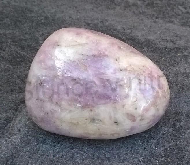 Tento celoleštěný vzorek lepidolitu s křemenem a albitem o váze 42,8 g pochází z Brazílie a patří mezi velmi atraktivní sběratelské kameny. Jedná se o přírodní pegmatit, ve kterém se krásně prolínají jemné fialové tóny lepidolitu, světlé odstíny albitu a čiré až mléčné části křemene.