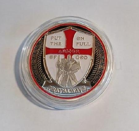 Na přední straně templář, rytíř v plné zbroji s nápisem Oblékněte si plnou zroj boží, vždy se modlete, na zadní straně zobrazuje rytíře, templáře v plné zbroji se štítem a červeným křížem, který je symbolem řádu. Jedná se o známý nápis spojený s řádem templářů. Pečeť s podobným nápisem a křížem se používala jako jejich oficiální pečeť. Mince je v plastové kapsli, pro udržení perfektního vzhledu a vysoké lesku není doporučováno kapsli rozdělávat. Nejžastěji se repliky - mince vyráběji ze slitiny zinku a mosazi.