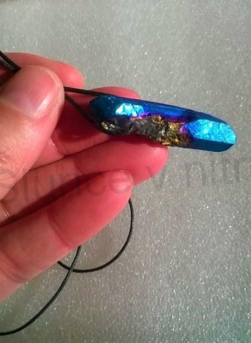 Unikatní přívěšek Aqva aury krystal na který se pomocí technologie nanaší tatán, titánium, Díky tomu je povrch mnohoznačně barevný a jak na něj svití světlo vytvaří se duhové barvy, efekty. Překrásný nepřehlednutý šperk, který vás na první pohled okouzlí.