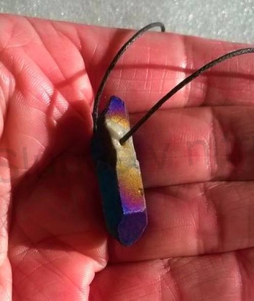 Přináší kombinaci výrazného duhového krystalu a minimalistické černé voskované šňůrky. Přívěšek je vytvořen technologií napařování titanu na přírodní krystal, což vytváří charakteristické duhové odlesky a měnící se barvy při dopadu světla. Tento typ šperku je oblíbený nejen pro svůj vzhled, ale také pro symboliku spojenou s energií a vibracemi minerálů.