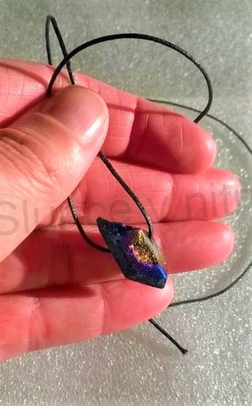 Přináší kombinaci výrazného duhového krystalu a minimalistické černé voskované šňůrky. Přívěšek je vytvořen technologií napařování titanu na přírodní krystal, což vytváří charakteristické duhové odlesky a měnící se barvy při dopadu světla. Tento typ šperku je oblíbený nejen pro svůj vzhled, ale také pro symboliku spojenou s energií a vibracemi minerálů.
