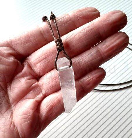 Tento minerální náhrdelník z přírodního křišťálu (X2019) je elegantní a energeticky silný doplněk, který se hodí pro ženy i muže. Přívěsek je vyroben z křišťálu ve tvaru hranolu, díky čemuž krásně vyniká jeho čistota, průhlednost a přirozená struktura. Každý kámen je originál — žádné dva kusy nejsou stejné, což dodává šperku osobitý charakter.